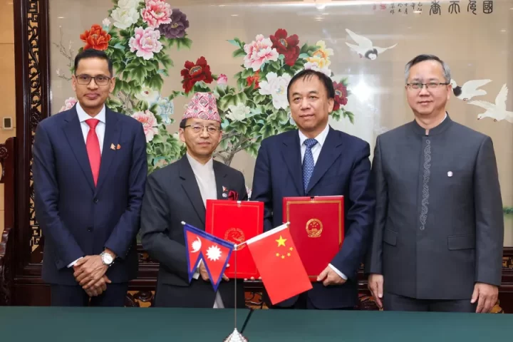 Acting Foreign Secretary Amrit Bahadur Rai (second left) and deputy head of China’s National Development and Reform Commission Liu Sushe (third) after signing the cooperation framework of the Belt and Road Initiative in Beijing on Wednesday. Photo: Courtesy of PM's Secretariat